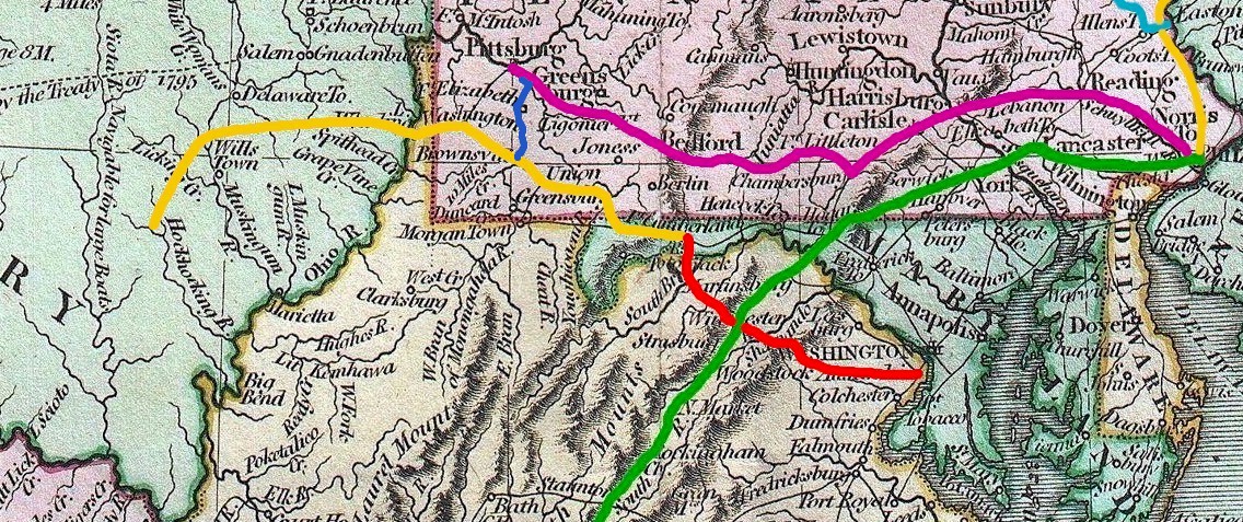 -From the northern Delaware Valley, my German ancestors migrated west on Owens Road to the Susquehanna River and later migrated west on Forbes Road across Pennsylvania and then down Zanes Trace to central Ohio.#2. Accessing the Interior by the National Road:
